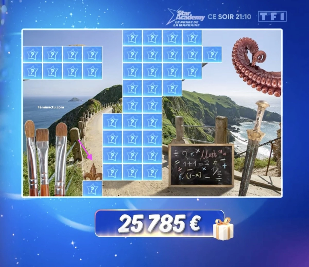 Encore un nouvel indice sur notre étoile mystérieuse en bas et à gauche de l’image, juste à côté des pinceaux. On distingue une fleur de lys. Du côté des autres indices, nous avons toujours une vue de Sercq, une petite île Anglo-Normande située dans la Manche, un tableau noir, une tentacule de pieuvre, des pinceaux et une dague (épée courte, ndrl).