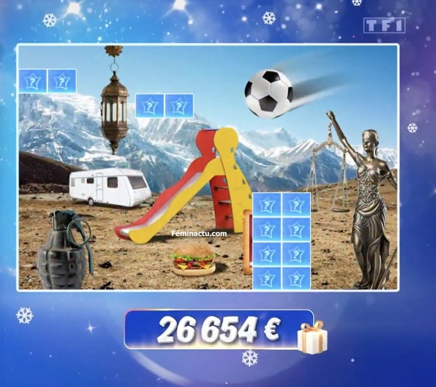 Récap des indices : une grenade, une statuette de la justice, une image du Népal avec la chaîne de l’Annapurna en toile de fond, un toboggan, une caravane, un burger, une lanterne, un petit beurre de Lu (cadre dans lequel se trouve la photo, ndrl) et un ballon de foot.