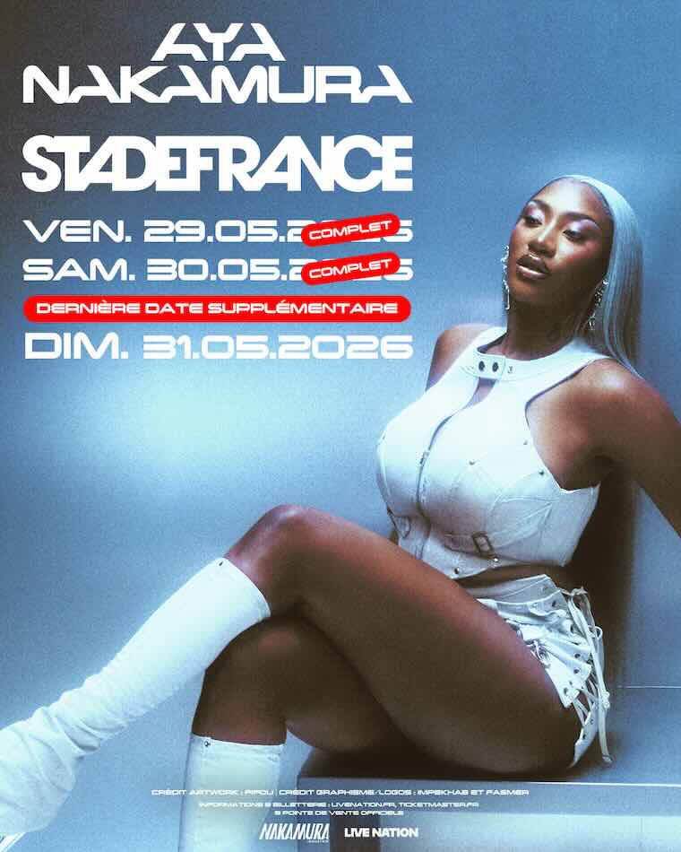 Aya Nakamura annonce un 3ème Stade de France le 26 mai 2026 ! Les deux premières dates des vendredi 29 et samedi 30 mai 2026 ayant affiché complet instantanément dès leur mise en vente (160 000 billets vendus) Aya Nakamura se produira une troisième fois, le dimanche 31 mai 2026, afin d’offrir à son public une ultime soirée mémorable au Stade de France.