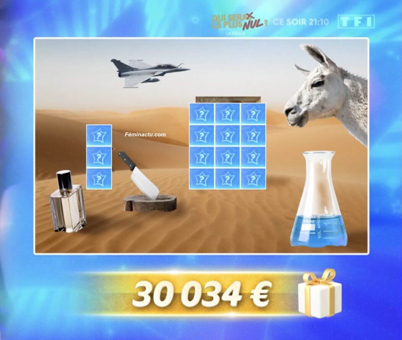 Récap des indices : le désert d’Oman, l’un des plus grand désert de sable du monde; un avion de chasse (un rafale, ndrl); un erlenmeyer, un flacon de parfum, une feuille de boucher, un lama.
