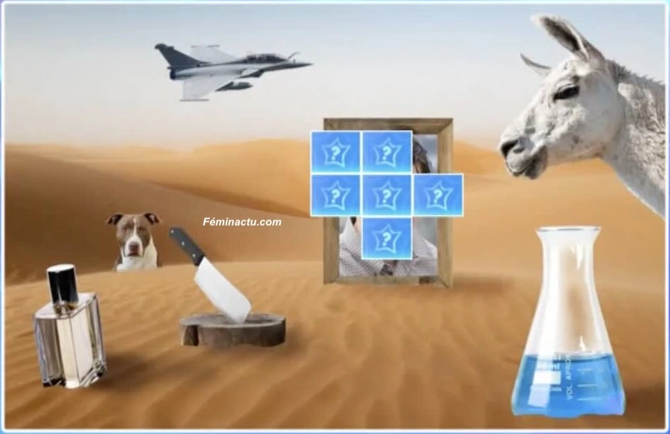 Récap des indices : le désert d’Oman, l’un des plus grand désert de sable du monde; un avion de chasse (un rafale, ndrl); un erlenmeyer, un flacon de parfum, une feuille de boucher, un lama, un chien.