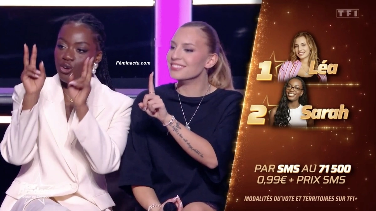 En attendant n’oubliez pas jamais que le seul moyen de sauver votre candidate préférée c’est d’envoyer son numéro par SMS au 71500 (0.99 euro + prix SMS) ou par téléphone en appelant le 3480 (0.99 euro par appel + prix appel). C’est le 1 pour Léa et le 2 pour Sarah.